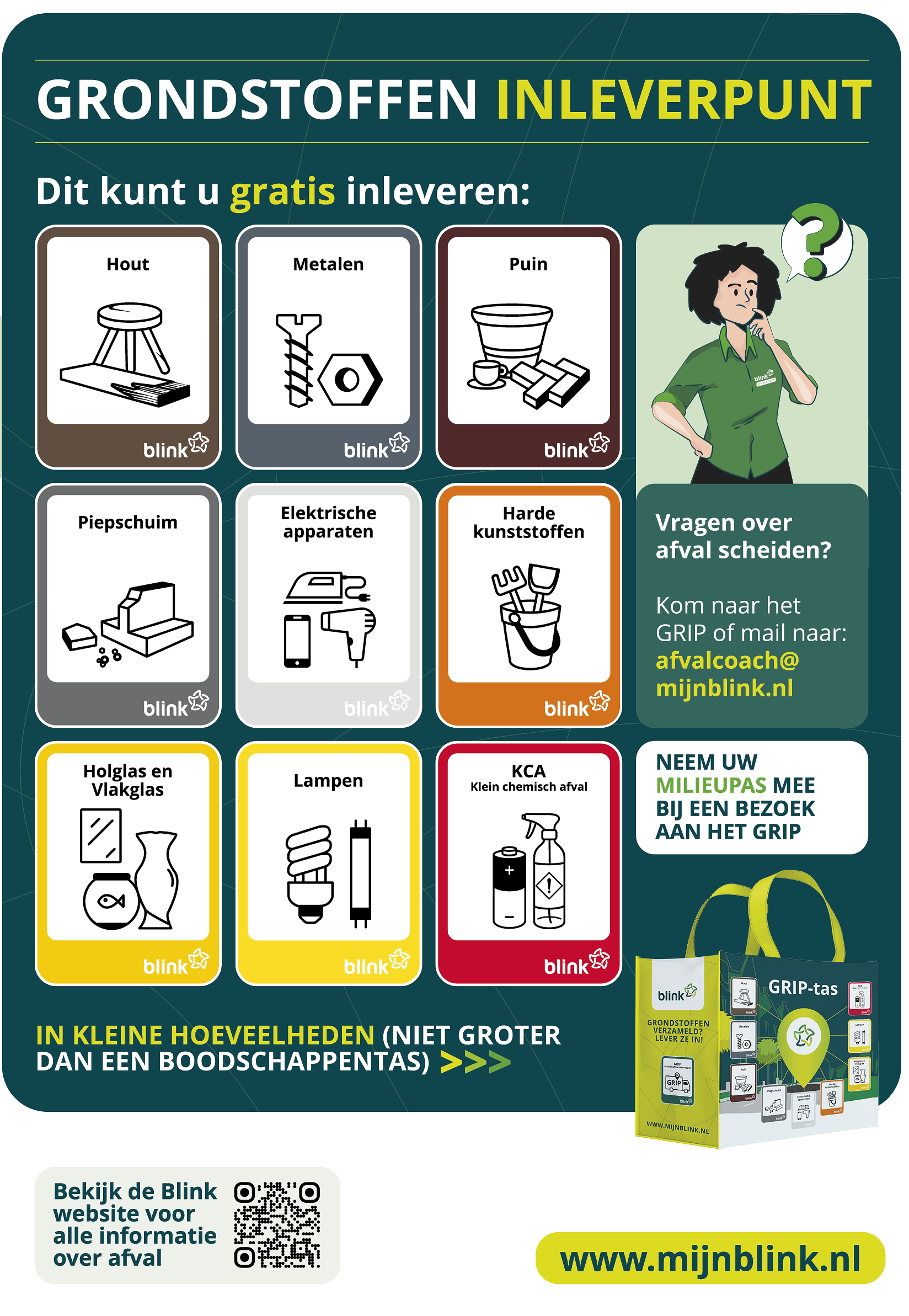 Ook zijn de afvalcoaches van Blink aanwezig bij de GRIP-wagen. Ze zijn hét aanspreekpunt voor al uw vragen over afval scheiden en helpen inwoners met praktische tips, geven advies over de verschillende afvalstromen en laten zien hoe afval scheiden makkelijker én leuker kan. Hun missie? Samen werken aan een toekomst zonder restafval. Want wie goed scheidt, houdt bijna niets over!