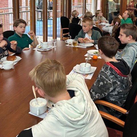 Wat een gezellige start van de dag! Dinsdagochtend schoof burgemeester Heldens aan bij de kinderen van groep 7 van basisschool de Dirk Hezius voor een lekker én gezond ontbijt, verzorgd door Bakkerij Godfried de Vocht.