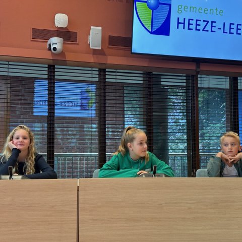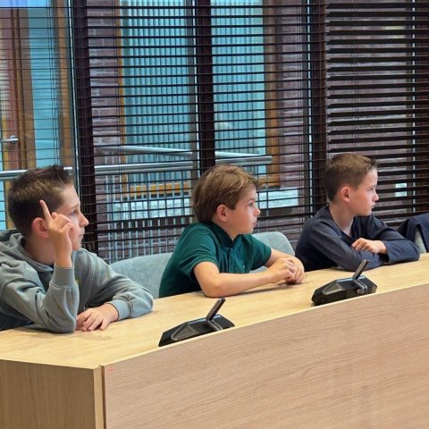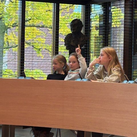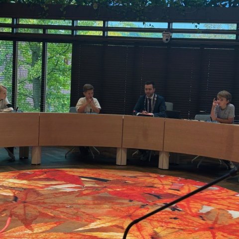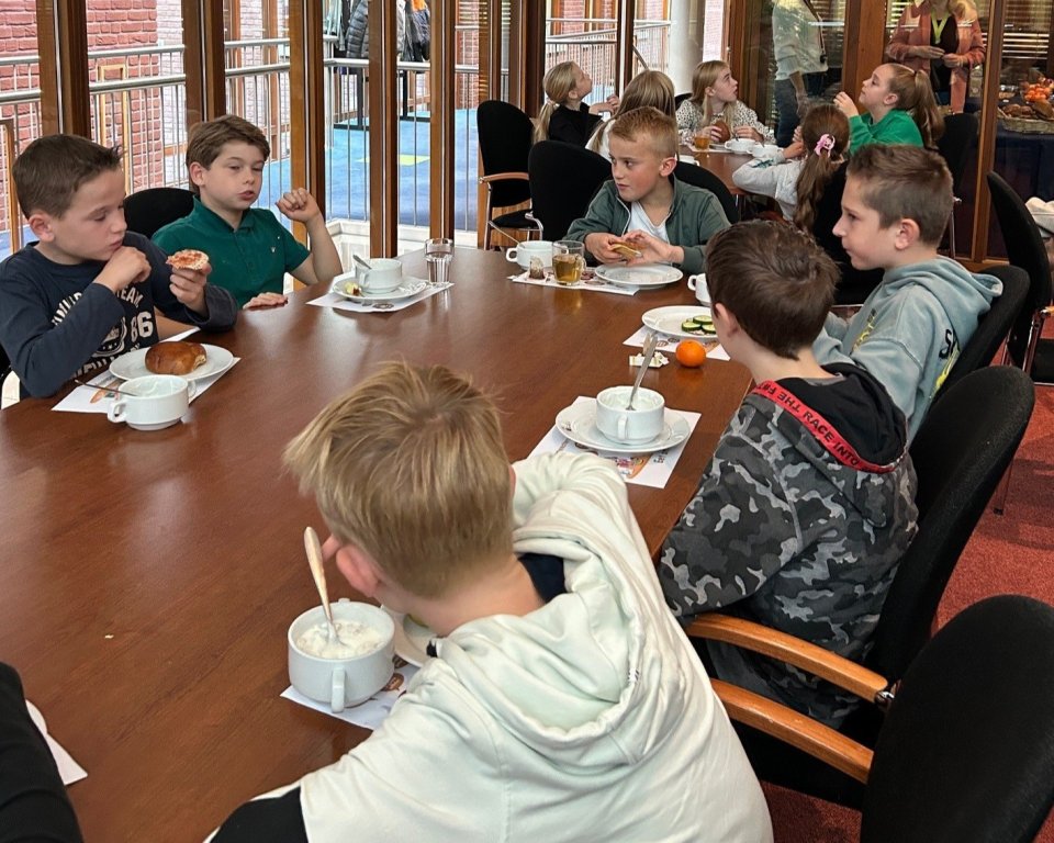 Na het ontbijt mochten de kinderen in de raadzaal vragen stellen aan de burgemeester. Ze luisterden aandachtig naar zijn antwoorden en kregen zo een kijkje in het werk van het gemeentebestuur.