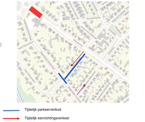 - Op de Burg. Deelenstraat (richting Burg. Serrarisstraat) en de Burg. Strijbosstraat (richting Geldropseweg) geldt tijdelijk eenrichtingsverkeer.